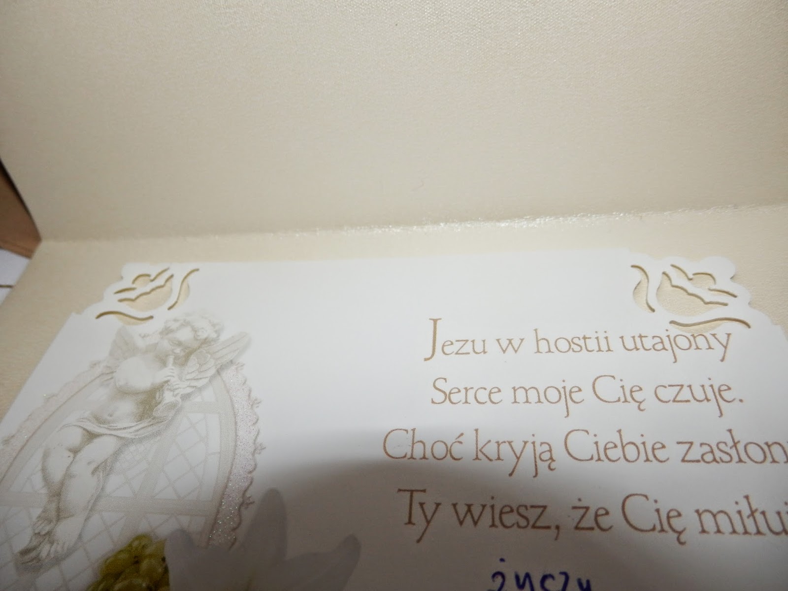 Jak bumerang powraca od czasu do czasu haft matematyczny.Bardzo dobrze mi się z nim pracuje,najgorszą męką jest robienie dziurek w kartce,ale opanowałam to.Ostatnio odrobina więcej czasu bym mogła tworzyć .Powstała kartka z życzeniami komunijnymi dla dwójki dzieci z klasy mojej córki.Większość dzieci przyjmowała swoja I Komunie Św. zeszłego roku w drugiej klasie prócz dwójki rodzeństwa które chodzi do innej parafii.A tam komunie są w 3 klasie.Tak oto musiała powstać kartka z życzeniami dla Małgosi i Tomka.Oto ona...ciut kombinowana.nie idealna bo drukarka w naprawie, nie było czym drukować napisów i życzeń.Niestety me pismo nie przypomina kaligraficznego.W późniejszym czasie powstała tez kartka urodzinowa dla Kingi Cz....o tym później...
